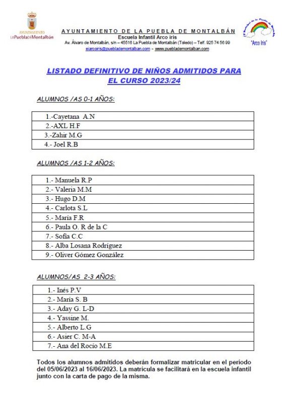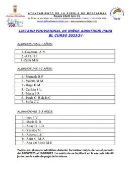 El Ayuntamiento de La Puebla de Montalbán publica la lista provisional de admitidos para la Escuela Infantil en el curso…
