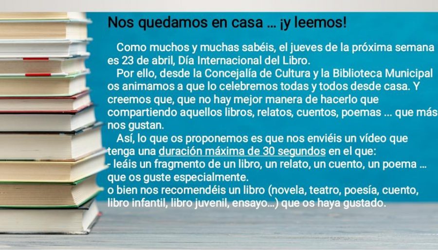Por ello, desde la Concejalía de Cultura y la Biblioteca Municipal os animamos a que lo celebremos todas y todos desde casa. Y creemos que, que no hay mejor manera de hacerlo que compartiendo aquellos libros, relatos, cuentos, poemas … que más nos gustan.