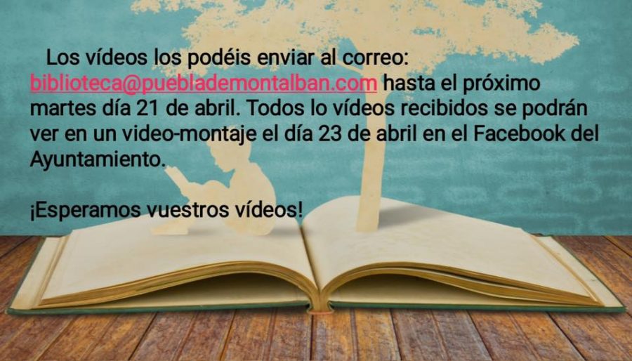 Los vídeos los podéis enviar al correo biblioteca@pueblademontalban.com hasta el próximo martes día 21 de abril. Todos lo vídeos recibidos se podrán ver en un video-montaje el día 23 de abril en el Facebook del Ayuntamiento.