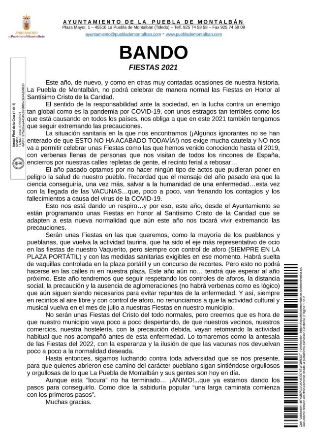 La situación sanitaria en la que nos encontramos, pese a haber mejorado respecto al pasado año, aún nos exige mucha cautela y NO nos va a permitir celebrar unas Fiestas como las que hemos venido conociendo hasta el 2019, con verbenas llenas de personas que nos visitan de todos los rincones de España, encierros por nuestras calles repletas de gente, el recinto ferial a rebosar…