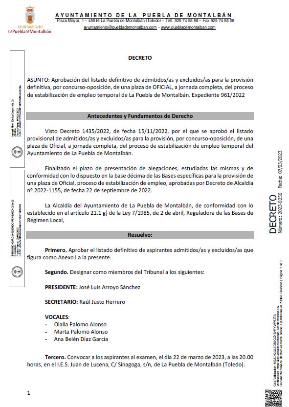 Aprobación del listado definitivo de admitidos/as y excluidos/as para la provisión definitiva, por concurso-oposición, de una plaza de OFICIAL, a jornada completa, del proceso de estabilización de empleo temporal de La Puebla de Montalbán