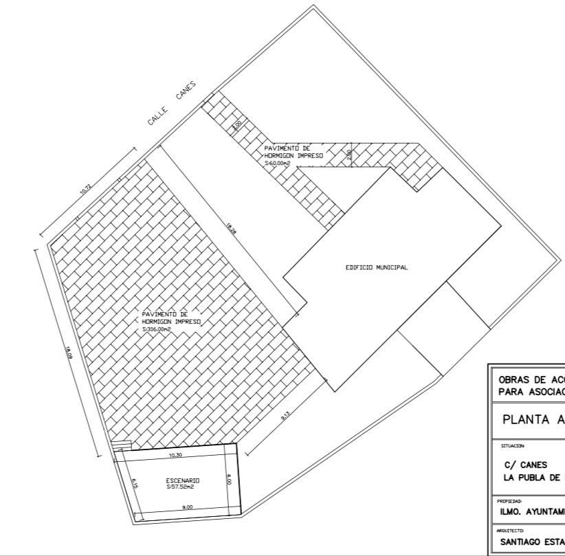Se ejecutará un escenario al aire libre al mismo tiempo que se procerá al pavimentado de una zona de paso al edificio así como de una zona de patio destinada a posible colocación de sillas para contemplar los actos que se lleven a cabo en el escenario proyectado.