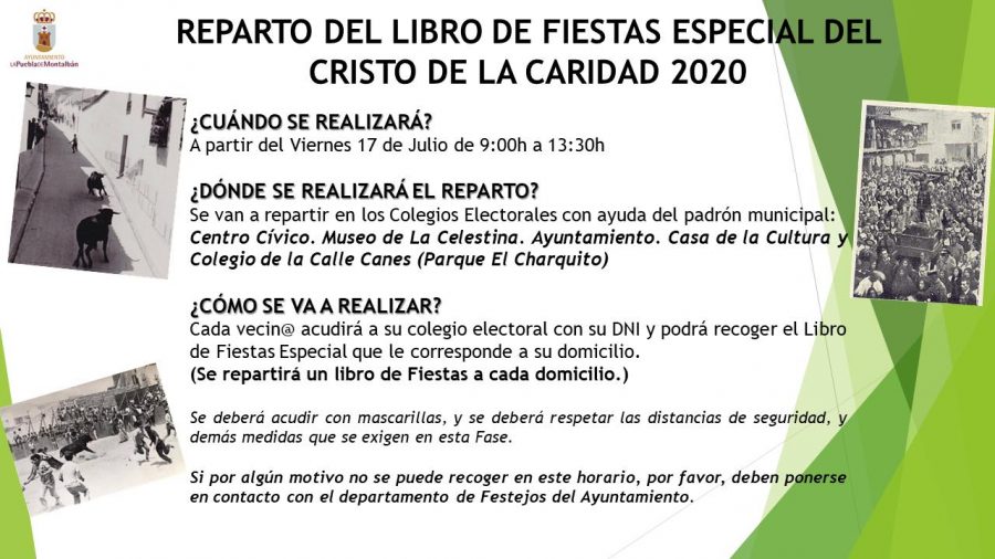 A partir del viernes 17 de Julio se podrán recoger en los diferentes colegios electorales el Libro de Fiestas Edición Especial 2020. Los libros se podrán recoger también el fin de semana cada vecino en su colegio electoral.