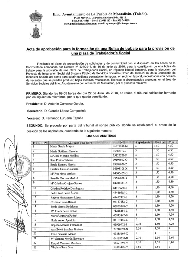 Publicación del acta de aprobación para la formación de una bolsa de trabajo para la provisión de una plaza Trabajador/a…