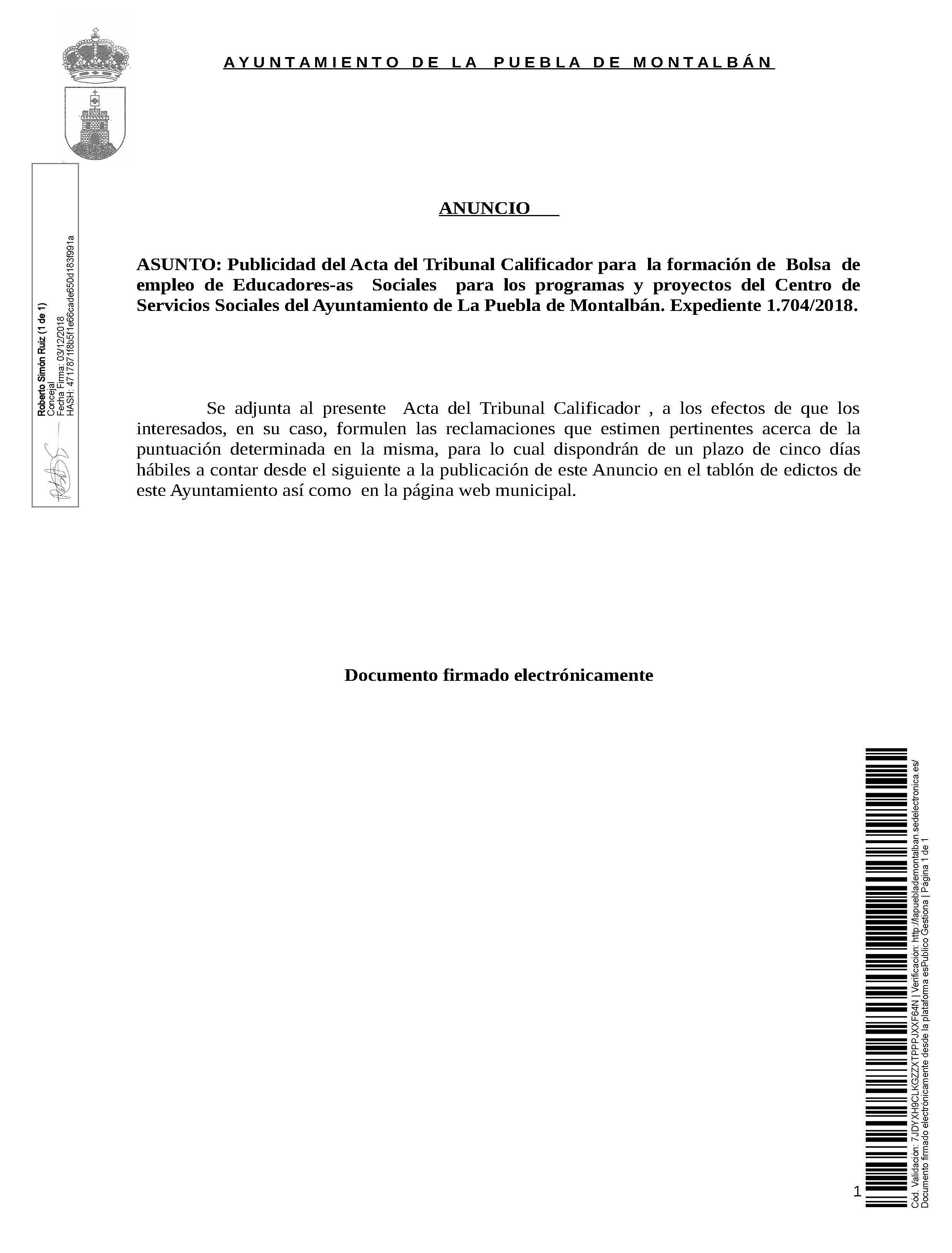 Información de interés Bolsa de empleo de Educadores/as Sociales – Acta Tribunal Calificador 3 diciembre, 2018