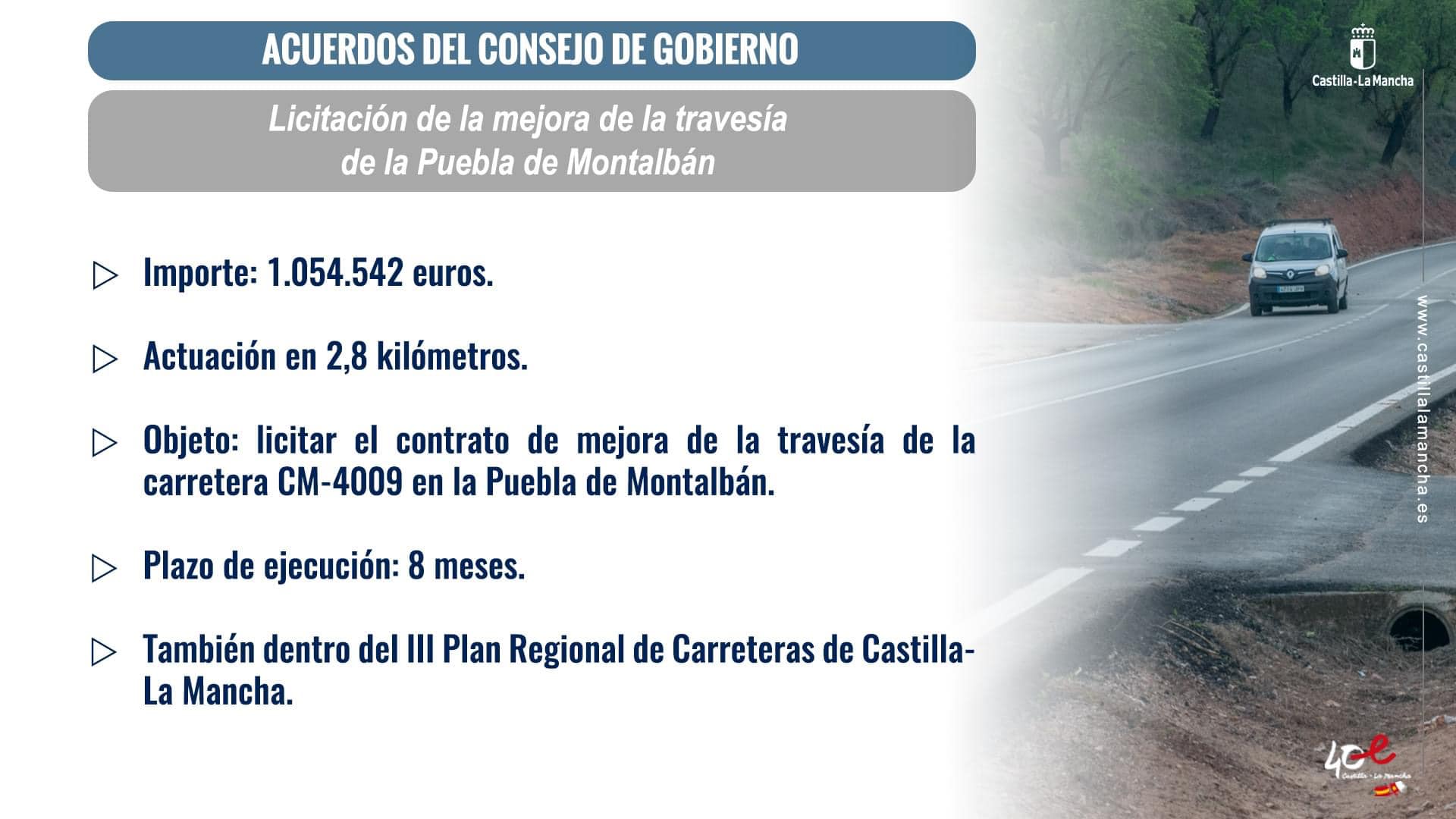 Esta actuación, contará con una inversión de 1.054.000 euros para licitar el contrato de mejora de la travesía de la carretera CM-4009 en la Puebla de Montalbán, en la que se actuará a lo largo de 2,8 kilómetros con un plazo de ejecución de ocho meses.