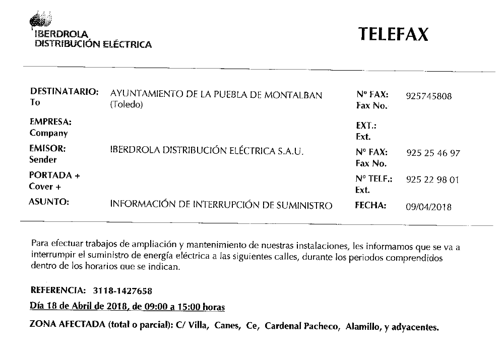 Según informa la compañia de Iberdrola Distribución Eléctrica, debido a trabajos de mejora y mantenimiento, tendrá lugar una interrupción del suministro eléctrico, el próximo miércoles 18 de abril, entre las 9 y las 15 horas. El corte afectará de forma total o parcial a las calles Villa, Canes, Ce, Cardenal Pacheco, Alamillo y adyacentes.