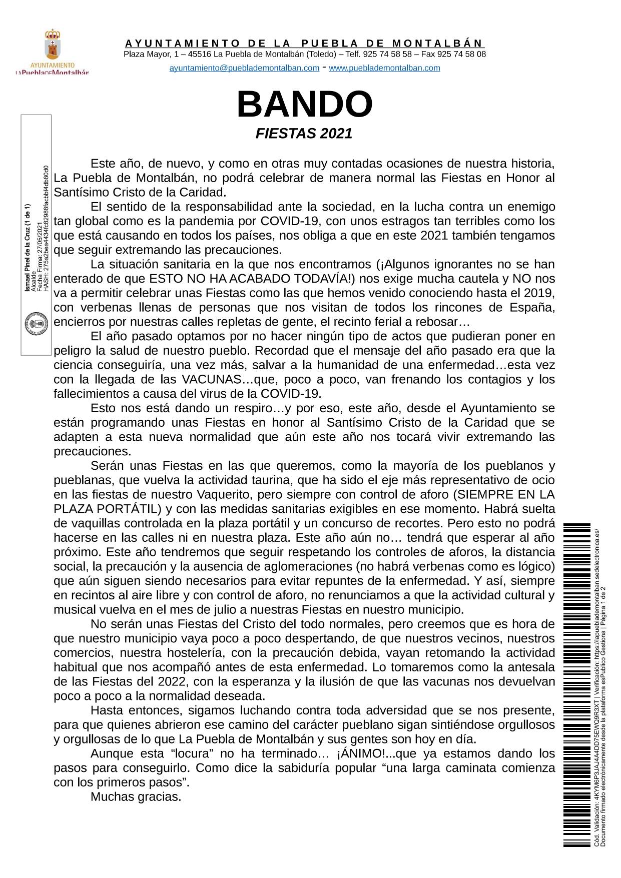 Este año, de nuevo, y como en otras muy contadas ocasiones de nuestra historia, La Puebla de Montalbán, no podrá celebrar de manera normal las Fiestas en Honor al Santísimo Cristo de la Caridad.