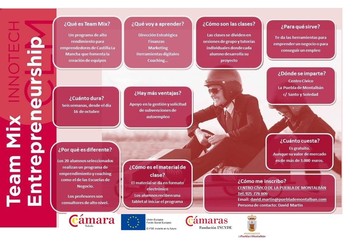 Si estas desempleado y quieres emprender un negocio, la Cámara de Toledo, en colaboración con el Ayuntamiento de La Puebla de Montalbán, te da las claves para hacerlo con garantías de éxito. ¿A qué esperas? Apúntate al programa gratuito TEAM MIX ENTREPRENEURHISP que comienza el próximo día 16 de octubre. Infórmate en el Centro Cívico.
