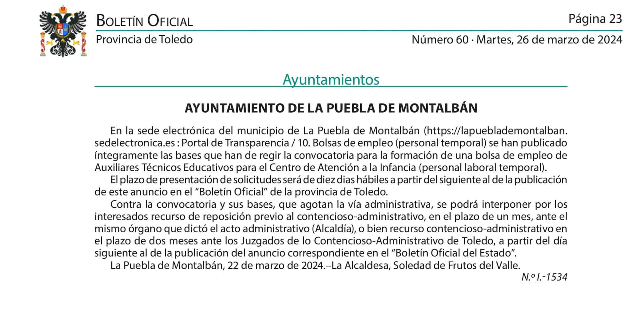 Publicadas la convocatoria para la formación de una Bolsa de Empleo de Auxiliares Técnicos Educativos para la Escuela Infantil Arco…
