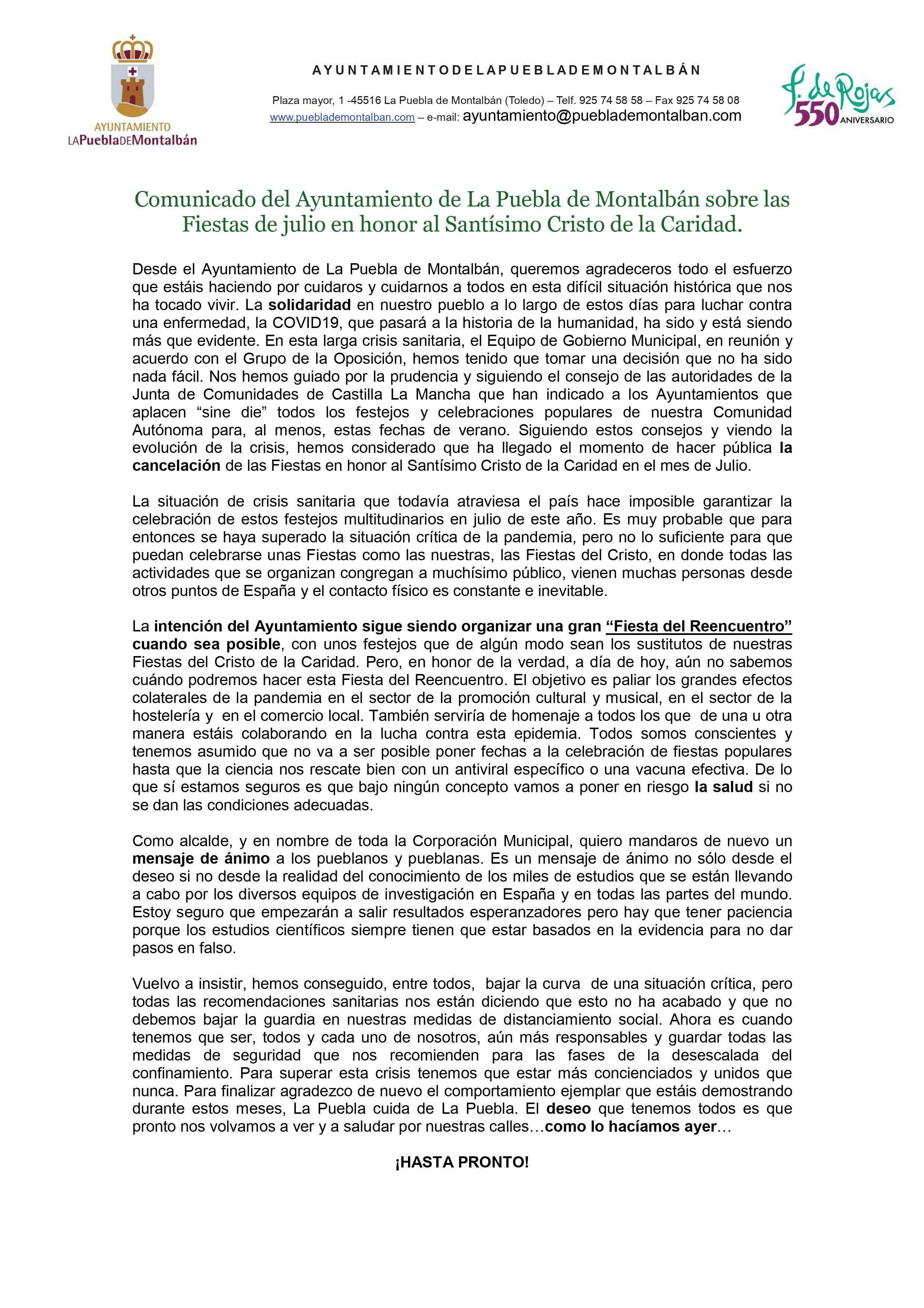 Comunicado del Ayuntamiento de La Puebla de Montalbán sobre las Fiestas de julio en honor al Santísimo Cristo de la Caridad