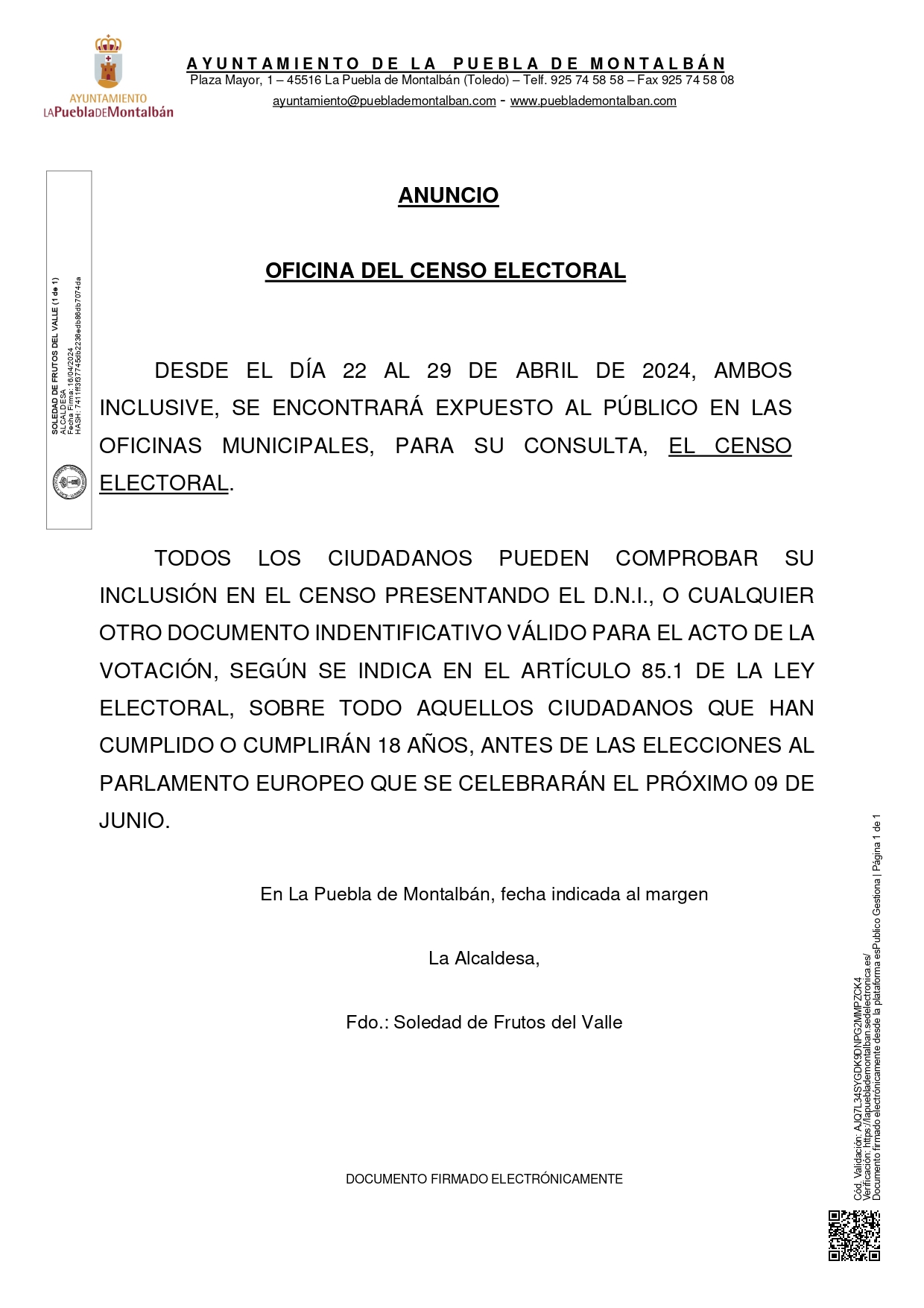 Se pone en conocimiento de la población, que desde el días 22 al 29 de abril de 2024, se encontrará…