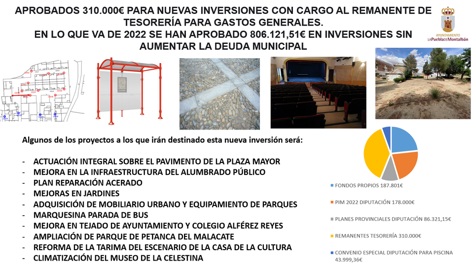 Algunos de los proyectos a los que irán destinado esta nueva inversión será:- ACTUACIÓN INTEGRAL SOBRE EL PAVIMENTO DE LA…