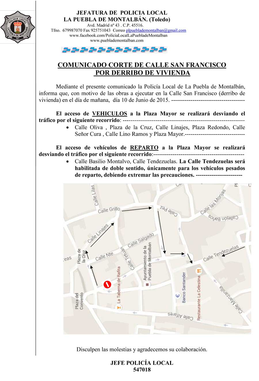 Mediante el presente comunicado la Policía Local de La Puebla de Montalbán, informa que, con motivo de las obras a ejecutar en la Calle San Francisco (derribo de vivienda) en el día de mañana, día 10 de Junio de 2015.
