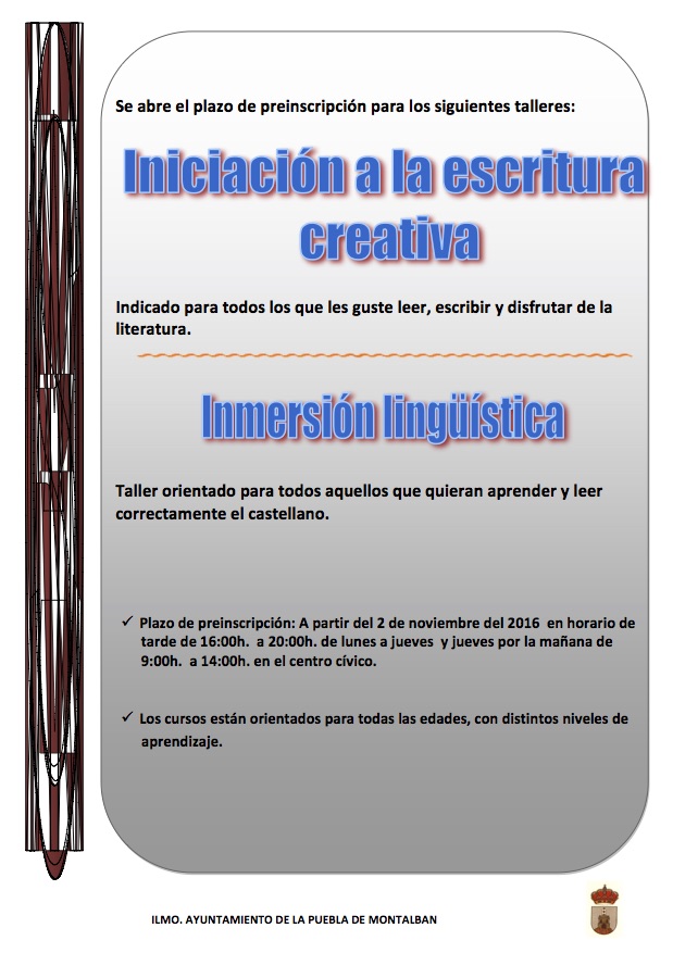 Se abre el plazo de preinscripción para los siguientes talleres en el Centro Cívico: Iniciación a la escritura creativa Inmersión lingüística Haz clic para compartir en Facebook (Se abre en una ventana nueva)Haz clic para compartir en Twitter (Se abre en una ventana nueva) Relacionado Navegación de entradas Inauguración y presentación de la obra «Mis Dulcineas de Melque» Premio COPE CLM 2016 para «La Recua Teatro»