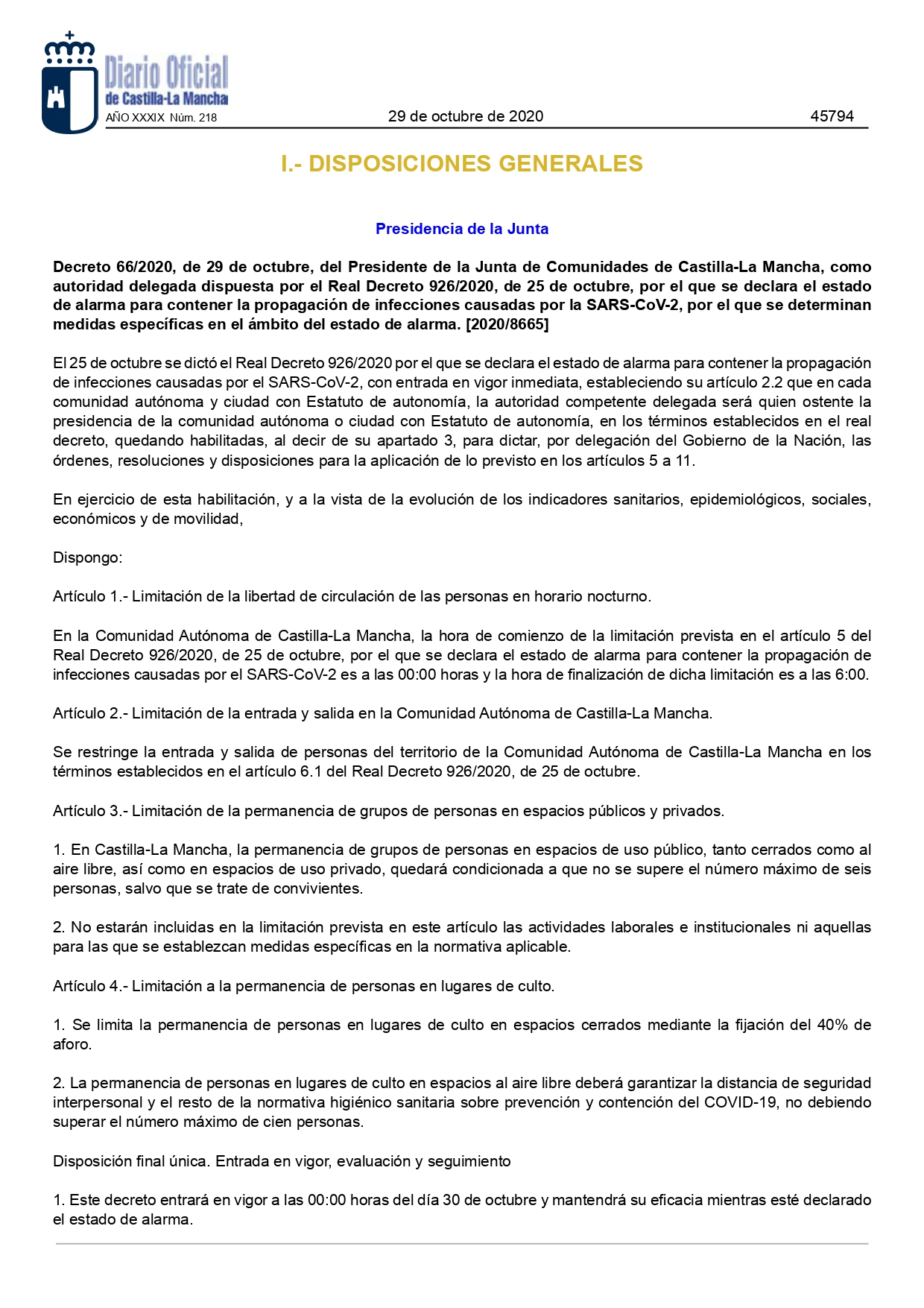 Decreto 66/2020, de 29 de octubre, del Presidente de la Junta de Comunidades de Castilla-La Mancha, como autoridad delegada dispuesta por el Real Decreto 926/2020, de 25 de octubre, por el que se declara el estado de alarma para contener la propagación de infecciones causadas por la SARS-CoV-2, por el que se determinan medidas específicas en el ámbito del estado de alarma.