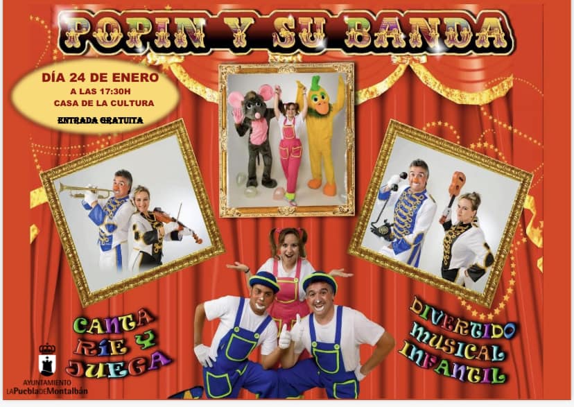 El próximo 24 de enero, dentro de la programación de actos del día de La Paz, contaremos en la Casa de la Cultura con este espectáculo infantil: Popin y su Banda