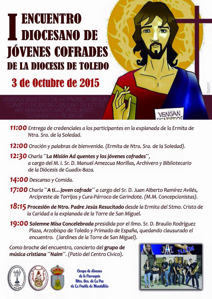 El próximo día 3 de octubre de los corrientes se celebrará en La Puebla de Montalbán el I Encuentro Diocesano de Jóvenes Cofrades de la Diócesis de Toledo, al cual están invitadas más de 427 Cofradías y Hermandades de la Archidiócesis de Toledo (Provincia de Toledo, una parte de Cáceres y otra parte de Badajoz) a las que se sumará la participación de las Cofradías, Hermandades y vecinos de La Puebla de Montalbán. La iniciativa parte de la Unión de Cofradías y Hermandades de Semana Santa de La Puebla de Montalbán con el objetivo de apostar y poner en alza los valores de la juventud cofrade.