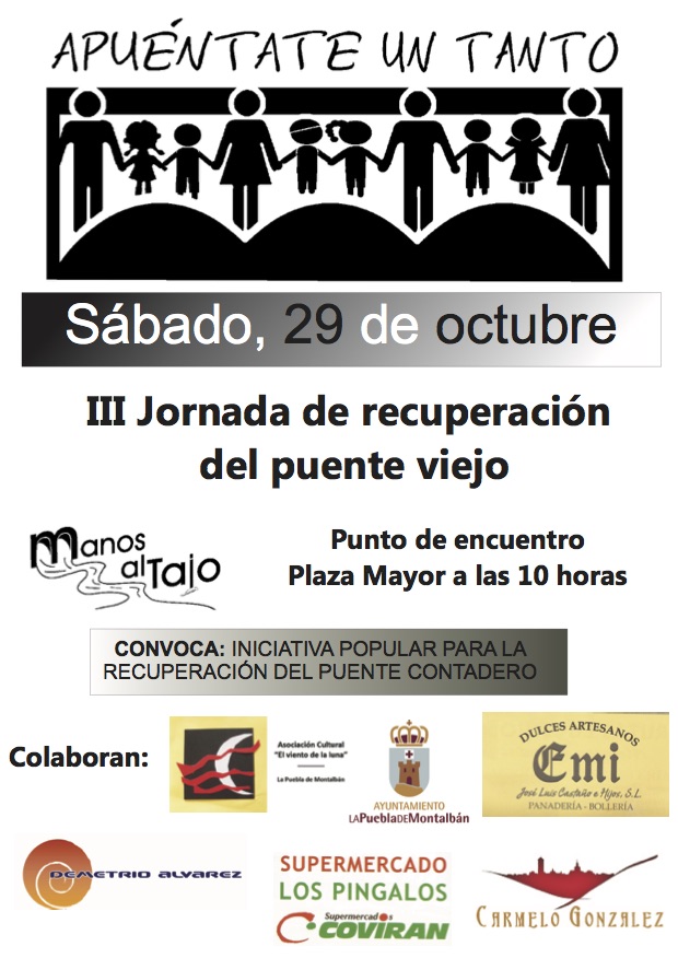 El próximo 29 de octubre tiene lugar la III jornada de recuperación del puente viejo (Puente Contadero) Haz clic para compartir en Facebook (Se abre en una ventana nueva)Haz clic para compartir en Twitter (Se abre en una ventana nueva) Relacionado Navegación de entradas Corte al tráfico en la Calle La Paz con Calle Varela Reunión con Telefónica sobre el despliegue de fibra óptica en La Puebla