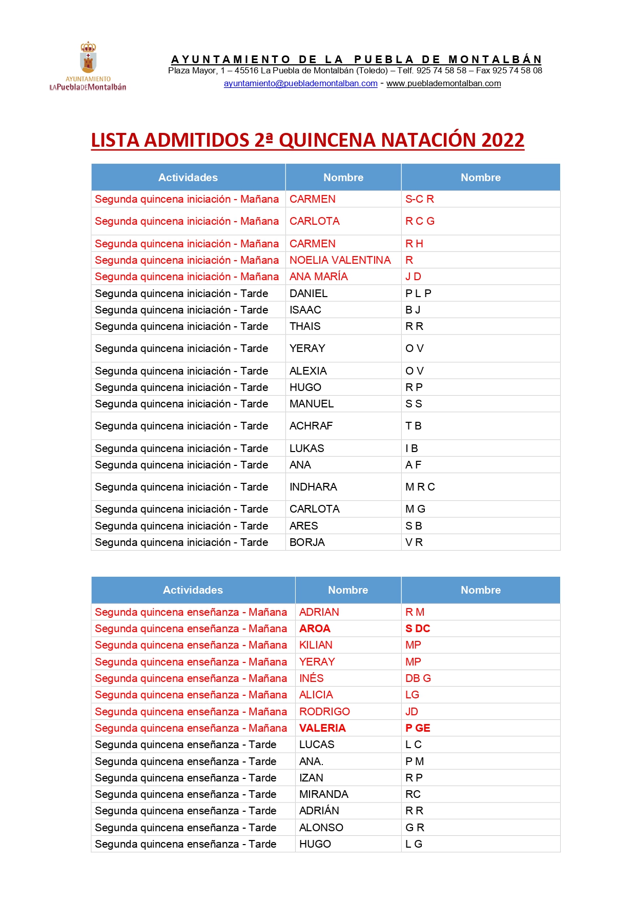 LISTA Haz clic para compartir en Facebook (Se abre en una ventana nueva)Haz clic para compartir en Twitter (Se abre en una ventana nueva) Relacionado Navegación de entradas LISTA DE ADMITIDOS PARA LA 1ª QUINCENA DE NATACIÓN 2022 ¡Vuelve la X NOCTURNA PUEBLANA!