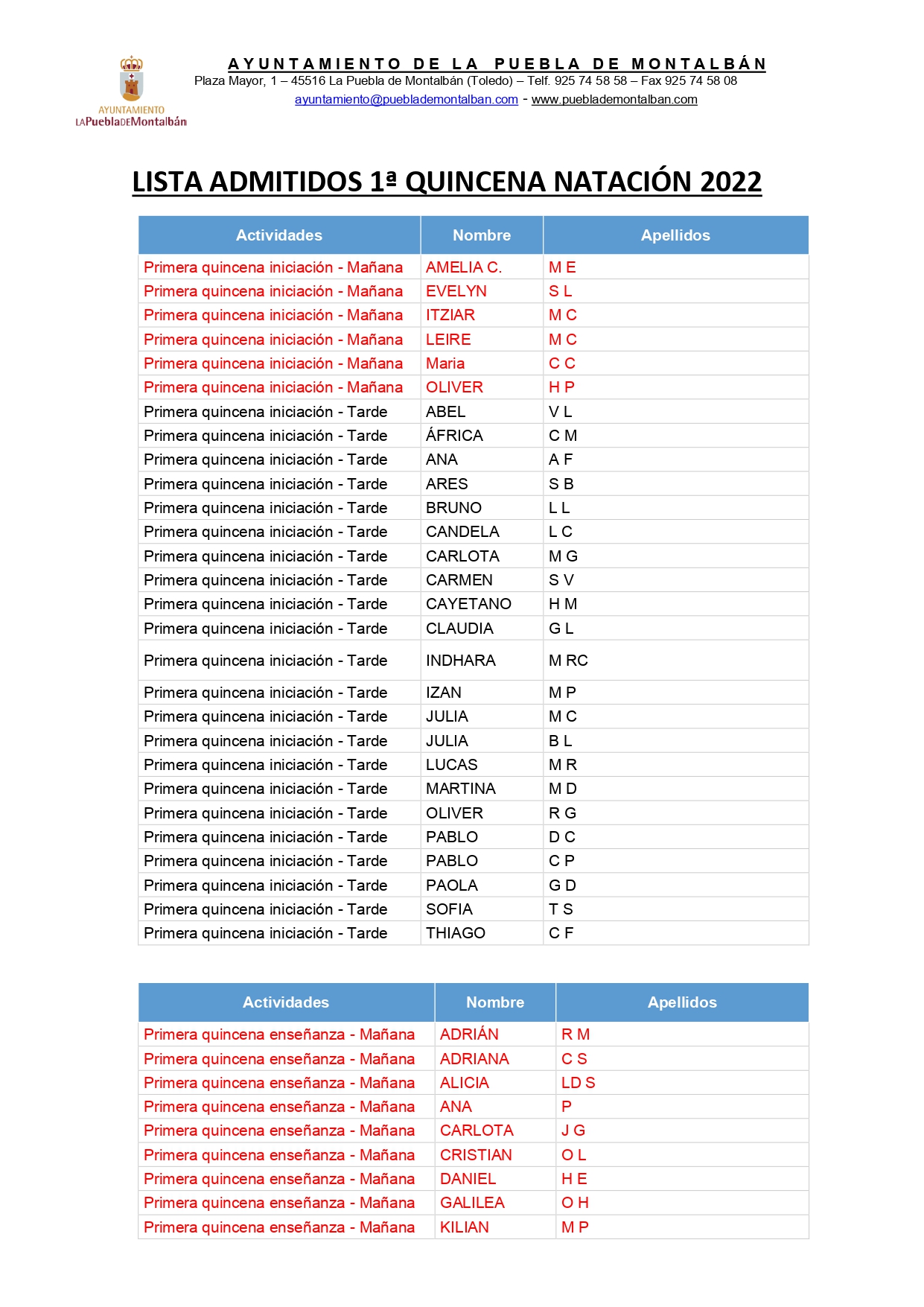 Haz clic para compartir en Facebook (Se abre en una ventana nueva)Haz clic para compartir en Twitter (Se abre en una ventana nueva) Relacionado Navegación de entradas REAPERTURA DE LA PISCINA MUNICIPAL VERANO 2022 Lista de admitidos en la 2ª quincena de natación