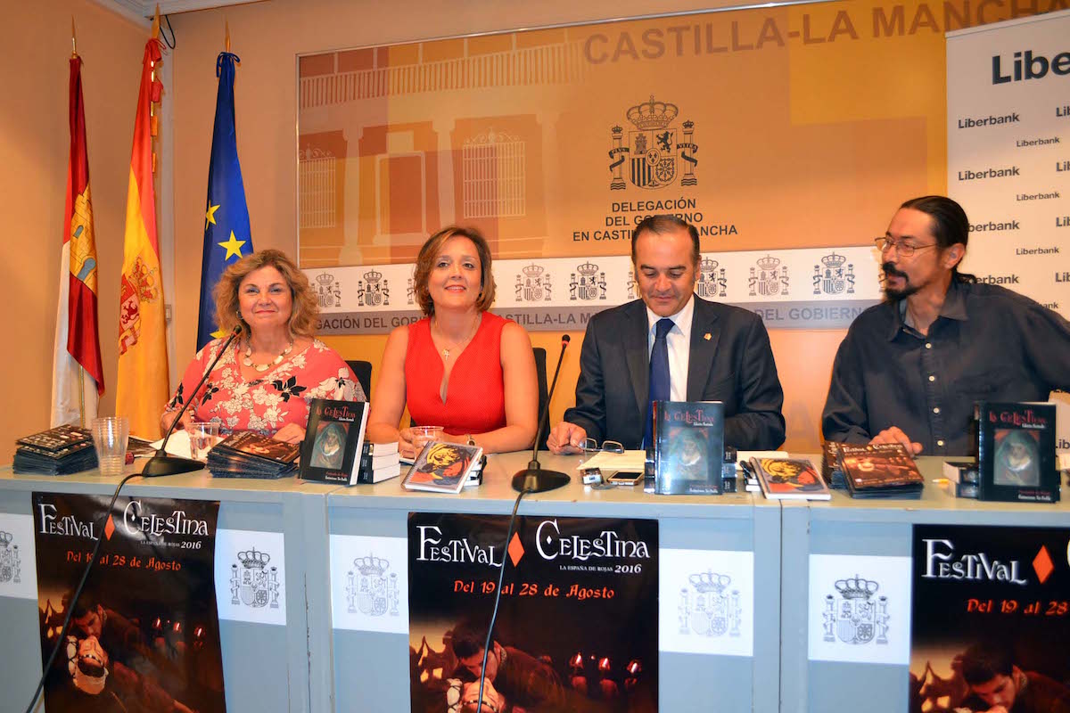 La alcaldesa de la localidad de La Puebla de Montalbán, Soledad de Frutos del Valle, acompañada del delegado del Gobierno en Castilla-La Mancha, José Julián Gregorio, la concejala de Cultura de la localidad, Dolores Sánchez y el director artístico del Festival, Luis María García, han presentado hoy en Toledo la XVIII Edición del Festival Celestina, La España de Rojas 2016, que acogerá desde mañana viernes 19 de agosto hasta el próximo 28 de agosto más de 130 representaciones teatrales, pictóricas, musicales, fotográficas, talleres, conciertos de música y muestras de arte en general en torno a la figura del ilustre bachiller Fernando de Rojas y su gran legado: La Celestina.