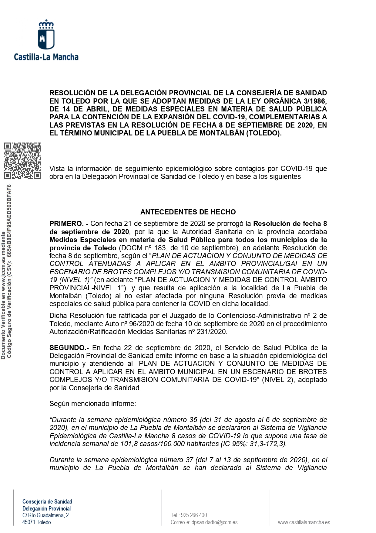 Información de interés Sin categoría RESOLUCIÓN DE LA DELEGACIÓN PROVINCIAL DE LA CONSEJERÍA DE SANIDAD EN TOLEDO POR LA QUE SE ADOPTAN MEDIDAS ESPECIALES EN MATERIA DE SALUD PÚBLICA PARA LA PUEBLA DE MONTALBÁN 22 septiembre, 2020 DOCUMENTO COMPLETO